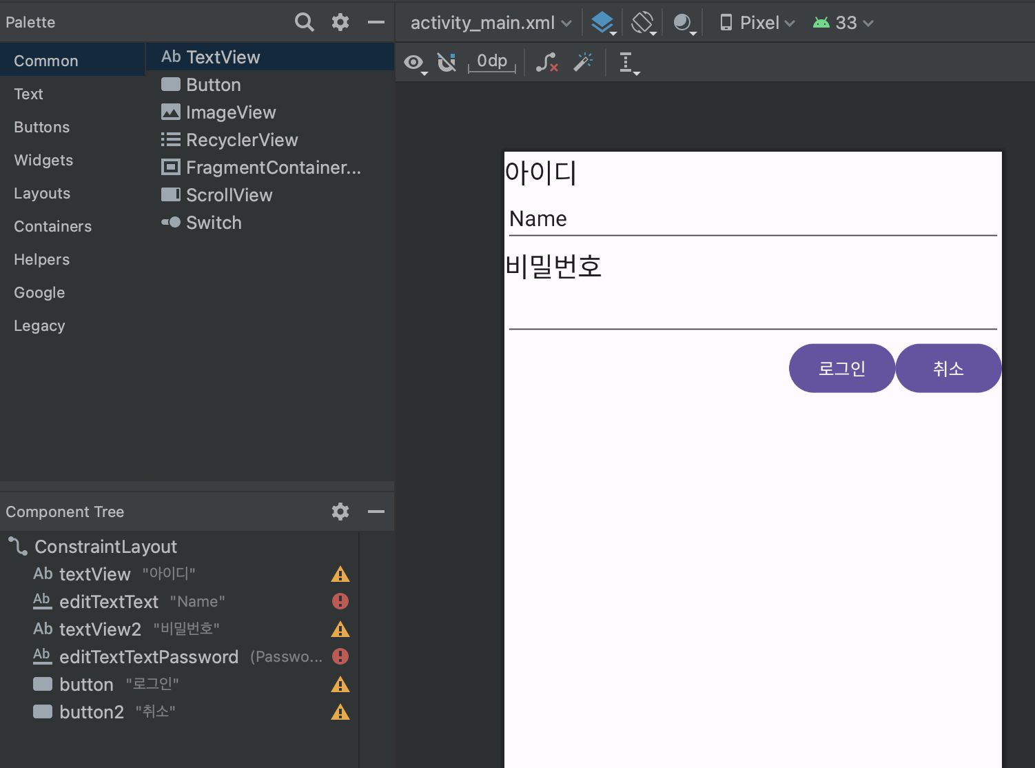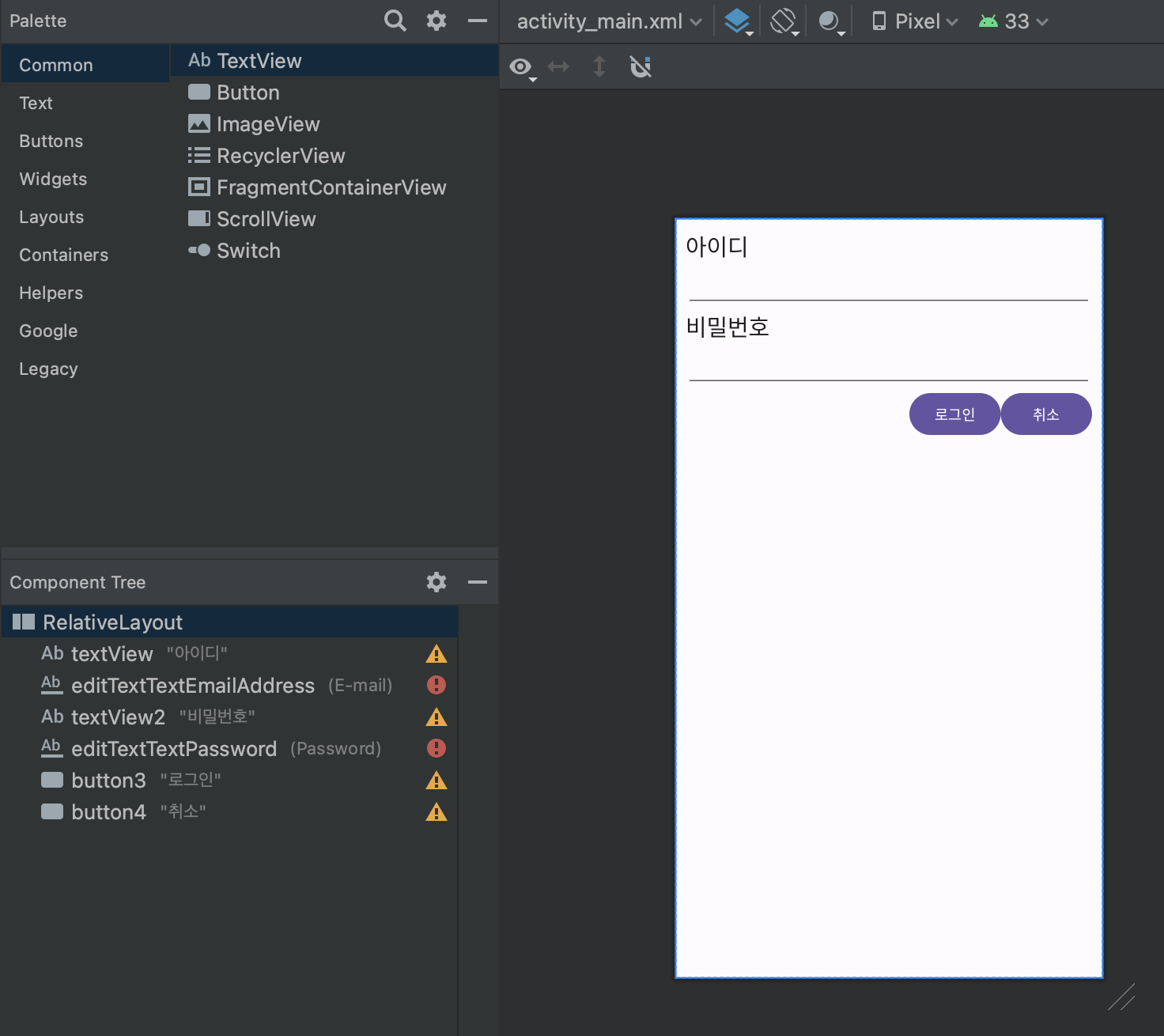 - android:layout_below="@id/editTextTextPassword" : editTextTextPassword의 하단에 배치한다.