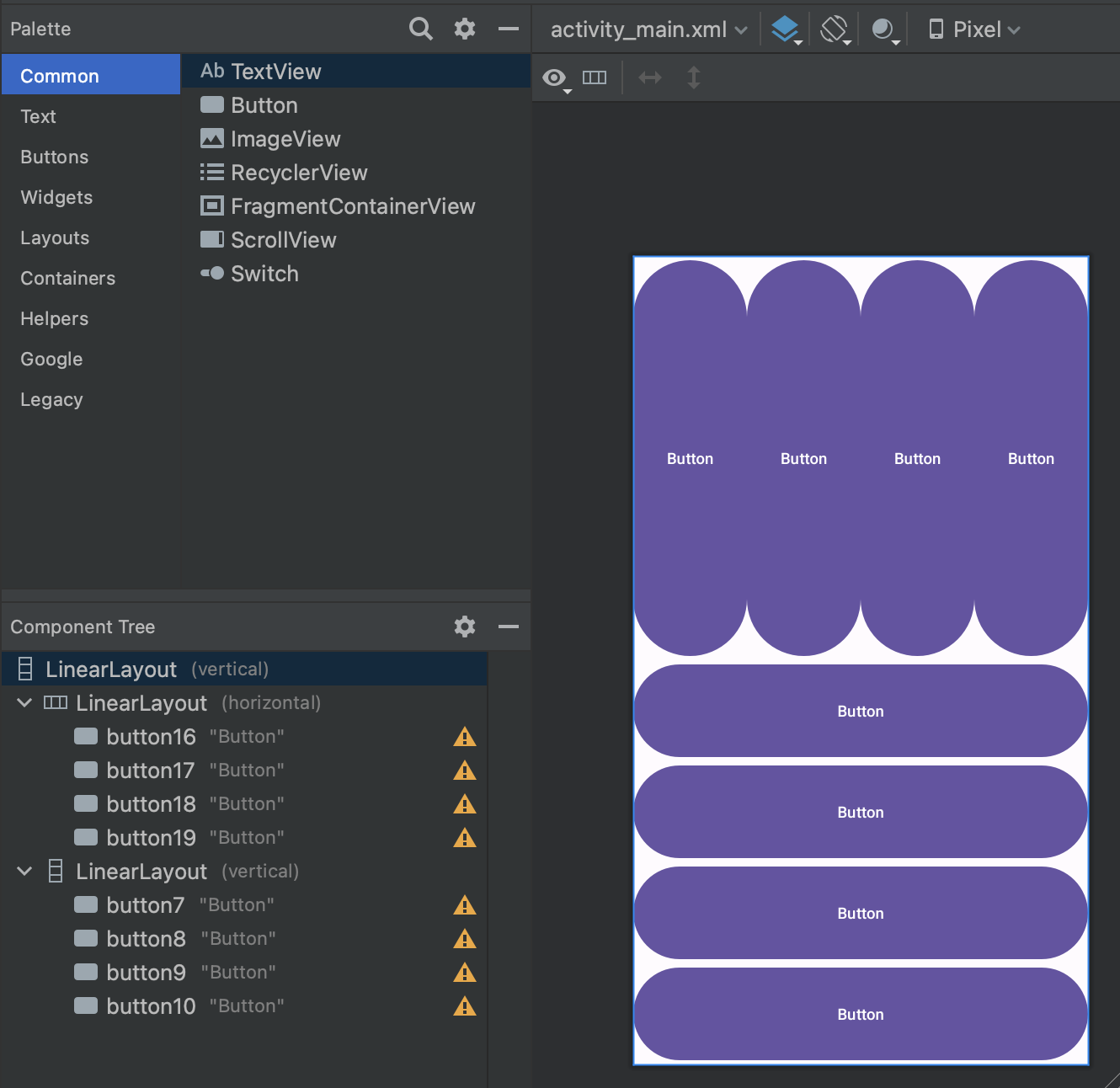 - 두 개의 LinearLayout를 배치하고 버튼을 4개씩 배치한다.
