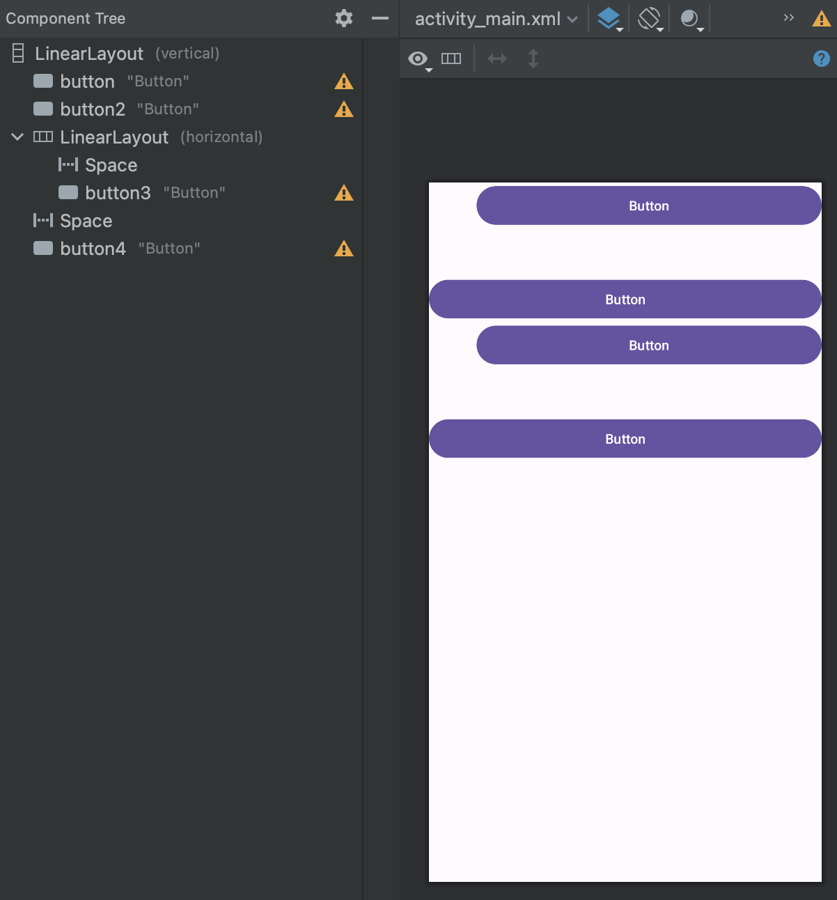 - Space를 layout_height="50dp"으로 설정하여 button4의 위쪽 여백을 표시한다.