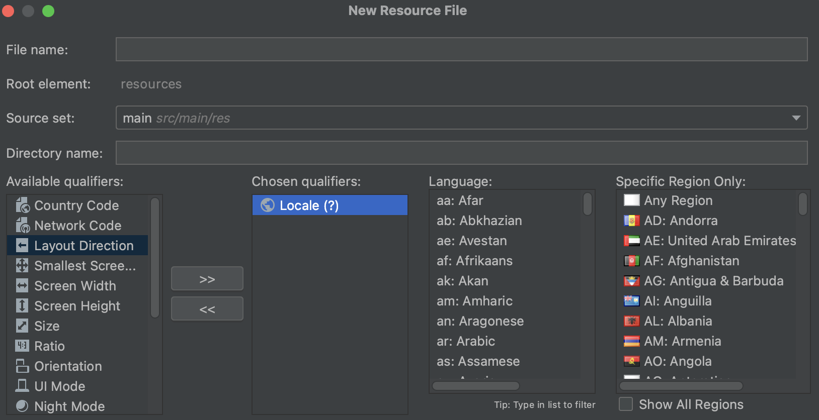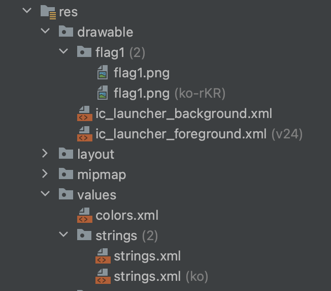 - 안드로이드는 res 폴더에 있는 리소스 폴더에 국가 코드를 추가하여 지역화를 할 수 있다.