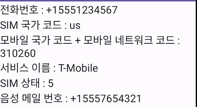textView.append("음성 메일 번호 : ${telephonyManager.voiceMailNumber}\n")