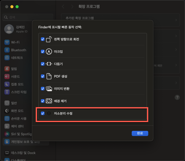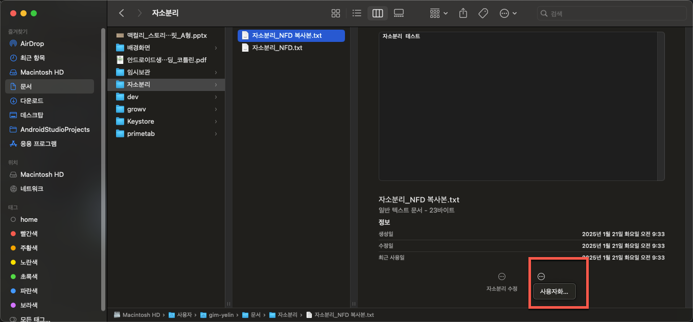 8. 저장 후 finder에서 아무 파일 선택하여 기타 > 사용자화 클릭