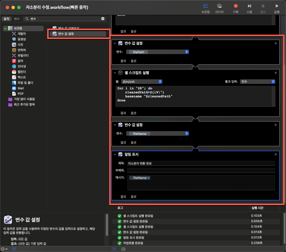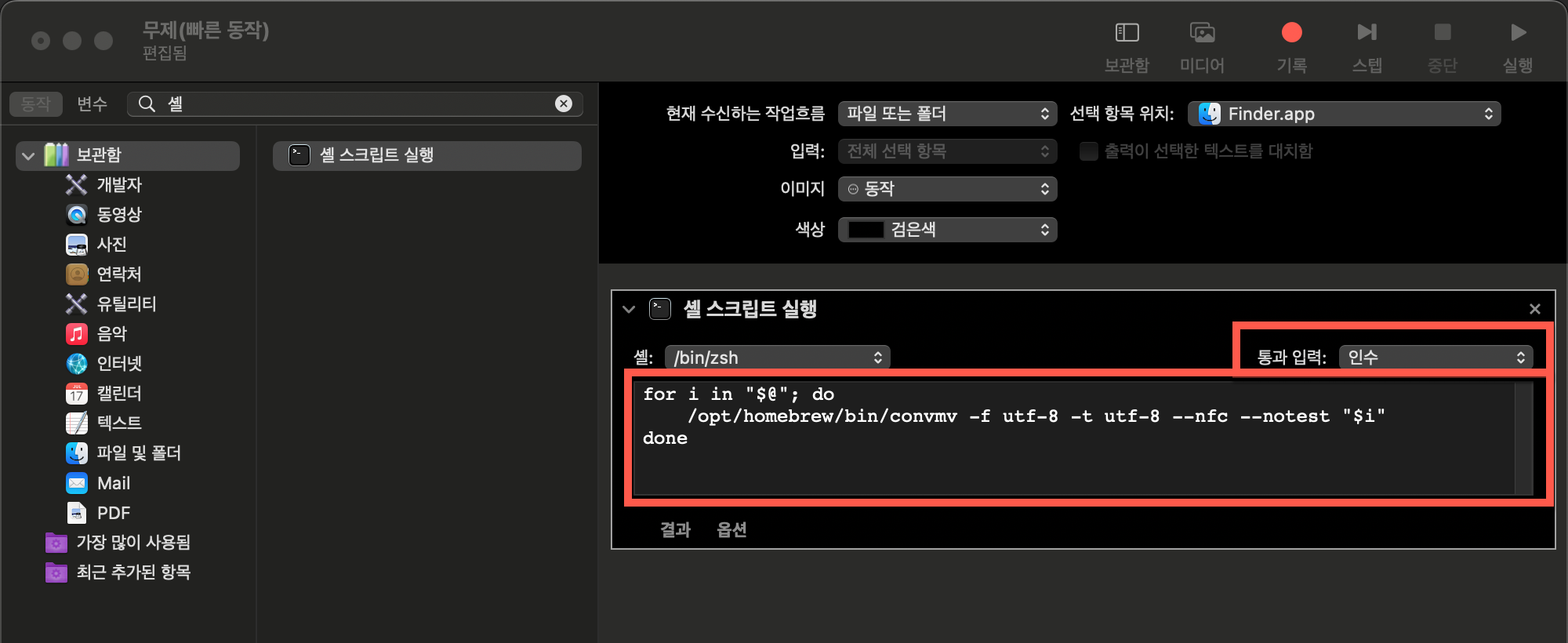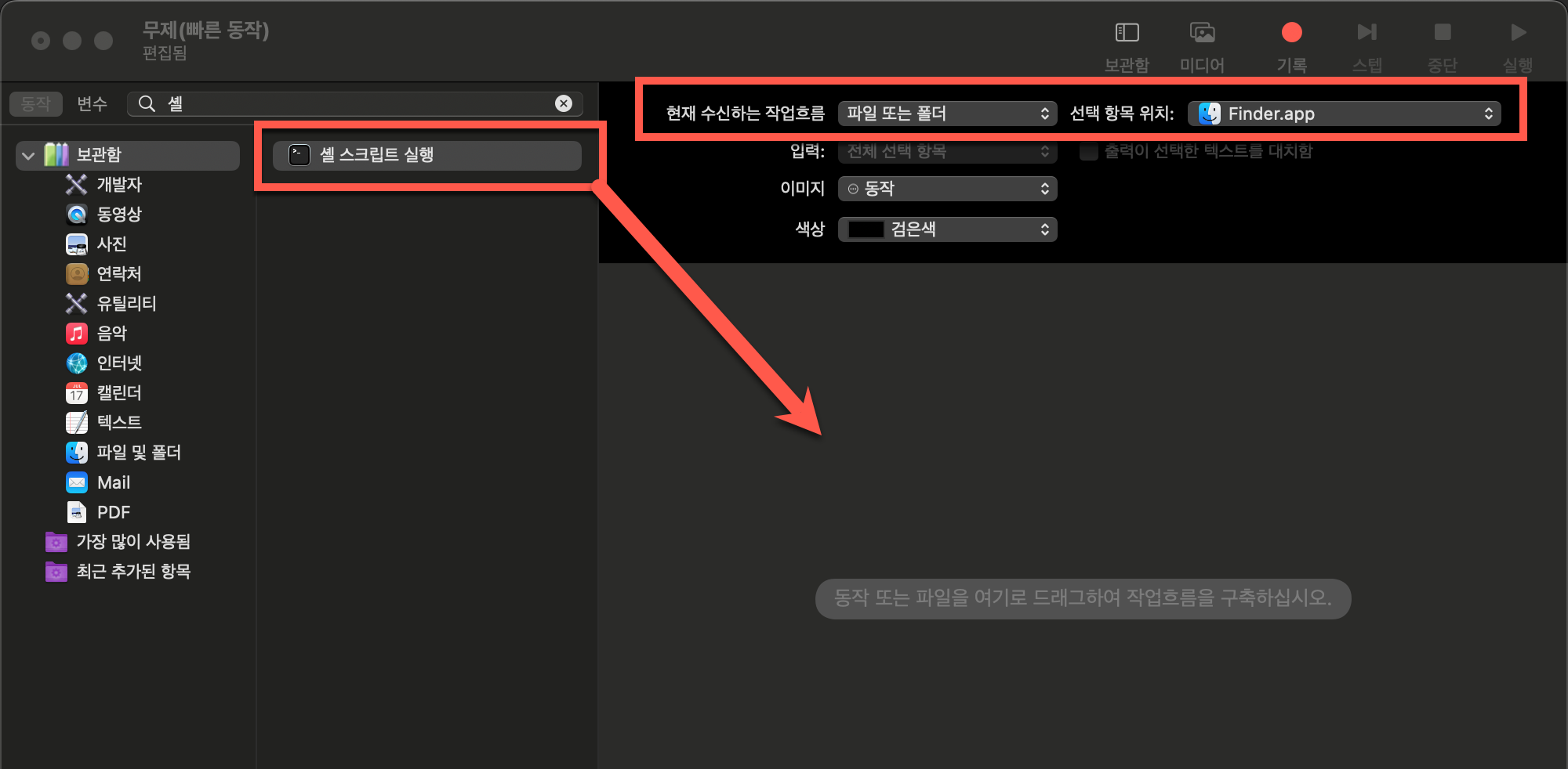 4. 왼쪽에서 ‘셸 스크립트 실행’ 검색하여 오른쪽으로 끌어당기기
