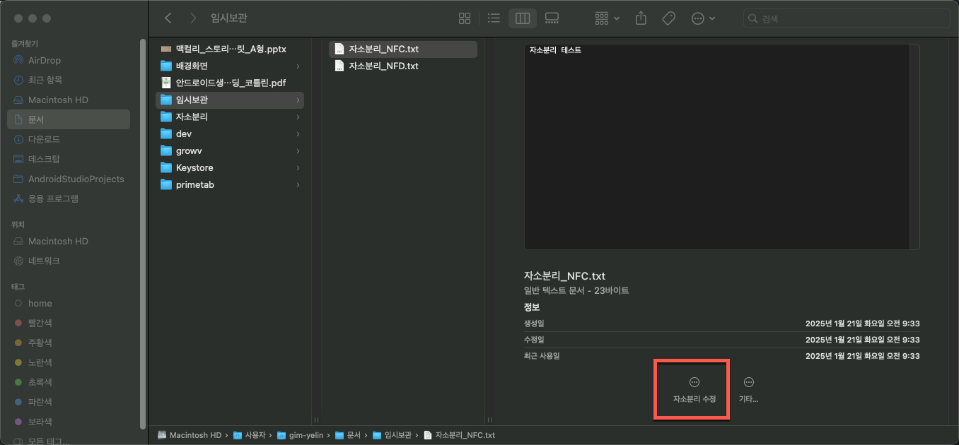 - 변환 후 재검사 시 NFC로 변환되어 저장되어있음