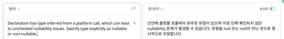파파고가 해석해준 것과 코틀린 문법을 생각해보면 null 관련 문제인 것 같았다.