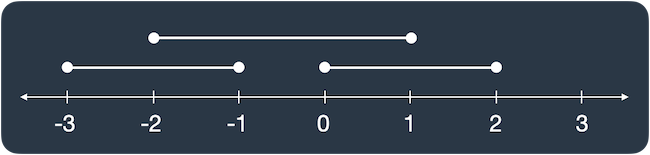 선분 3개가 평행하게 놓여 있습니다. 세 선분의 시작과 끝 좌표가 [[start, end], [start, end], [start, end]] 형태로 들어있는 2차원 배열 lines가 매개변수로 주어질 때, 두 개 이상의 선분이 겹치는 부분의 길이를 return 하도록 solution 함수를 완성해보세요. lines가 [[0, 2], [-3, -1], [-2, 1]]일 때 그림으로 나타내면 다음과 같습니다.