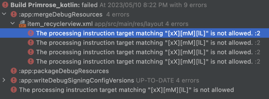 [안드로이드 스튜디오] The processing instruction target matching "[xX][mM][lL]" is not allowed. 본문