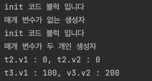 - t3에는 매개 변수로 100과 200을 넣었으므로 매개 변수가 두개인 생성자를 호출하여 객체를 생성한다.