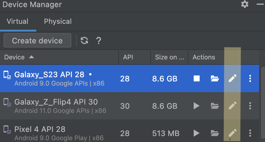 2. 오른쪽 상단(에뮬레이터 위)에 생기는 Device Manager에서 변경하고자 하는 에뮬레이터의 Actions - 연필모양 클릭